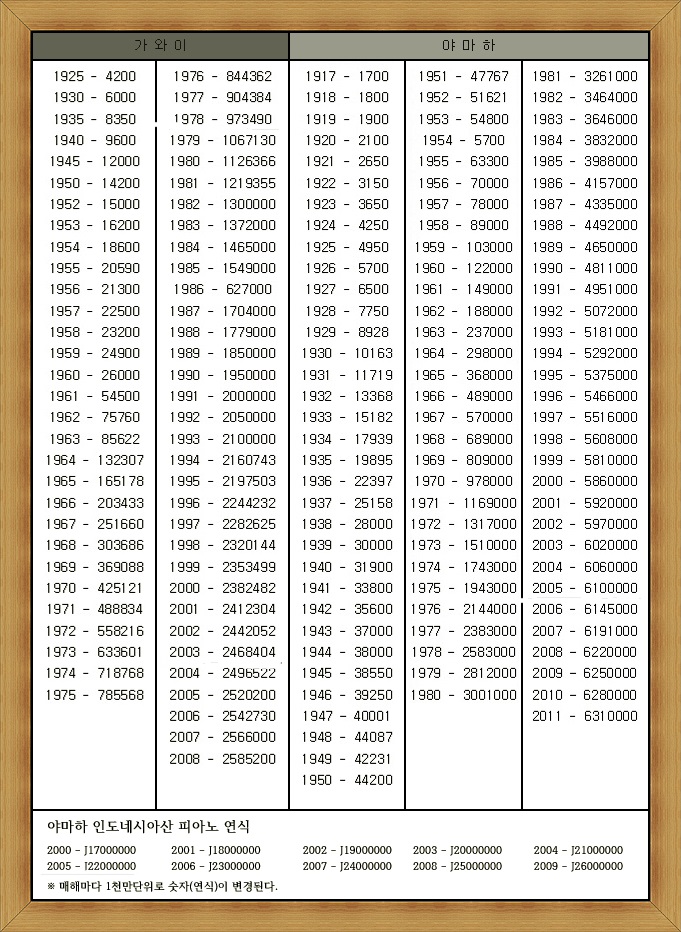 야마하 피아노 제조연도표 / 가와이 피아노 제조 연도표 페이지 정보 작성자 piano 작성일 17-09-24 08:32 조회 1,572회 목록 본문 야마하 피아노 제조연도.제작연도/ 야마하 피아노 제조번호 /중고 야마하 피아노 야마하 피아노 제조연도.제작연도/ 야마하 피아노 제조번호/ 야마하 그랜드피아노 제조번호 /중고야마하피아노 야마하 피아노 제조연도.제작연도/ 야마하 피아노 제조번호/ 야마하 그랜드피아노 제조번호 /중고야마하피아노 댓글목록 등록된 댓글이 없습니다. 목록